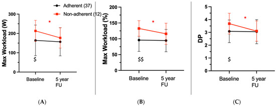 Exercise testing findings. (A) Comparison of maximum Workload (W) at baseline and follow-up. (B) Comparison of maximum Workload (%) at baseline and follow-up. (C) Comparison of double product (DP) factor at baseline and follow-up. Red line indicates cohort, who continued physical activity (non-adherent); black line indicates cohort, who stopped physical activity (adherent). * indicates p < 0.05 for paired t-test. $ indicates p < 0.05, $$ indicates p < 0.005 for independent Student’s t-tests between the two cohorts.
