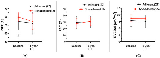 Echocardiographic findings. (A) Comparison of left ventricular ejection fraction (LVEF%) at baseline and follow-up. (B) Comparison of fractional area change (FAC%) at baseline and follow-up. (C) Comparison of right ventricular end-diastolic area indexed (RVEDAi cm2/m2) at baseline and follow-up. Red line indicates cohort, who continued physical activity (non-adherent); black line indicates cohort, who stopped physical activity (adherent $ indicates p < 0.05 for independent Student’s t-test between the two cohorts.