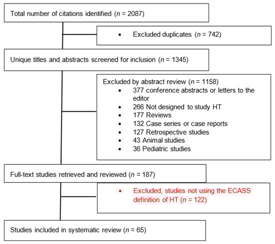 Flow diagram of the study selection process. HT—Hemorrhagic Transformation; ECASS—European Cooperative Acute Stroke Study.