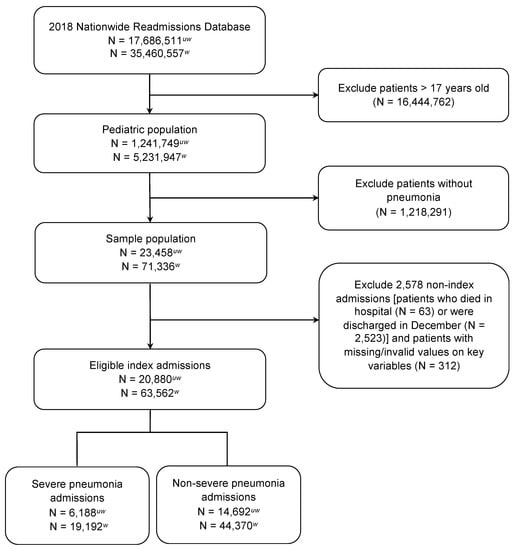 Our study sample consists of hospitalizations in a pediatric cohort under 18 years of age. To identify pneumonia cases, we selected all hospitalizations with a primary International Classification of Diseases, Tenth Revision, Clinical Modification (ICD-10-CM) diagnosis code for pneumonia (ICD codes shown in Supplement Table S1). To further identify eligible cases, we also selected cases with a primary diagnosis for either septicemia (038.xx) or acute respiratory failure (518.8x) and secondary diagnosis for pneumonia because these conditions are often related to pneumonia. Our definition of pneumonia is developed from an administrative data-based algorithm by Whittle et al., which was shown to have 84% sensitivity, 86% specificity, and 92% PPV []. Similar algorithms have been employed in previous studies [,] and validation confirmed that using a claims-based algorithm yields similar performance to definite pneumonia cases confirmed by laboratory and radiographic evidence []. Patients with missingness on key variables (length of stay, total charge, death, visit link, and days to event) are excluded. To qualify as an index admission eligible for readmissions analysis, patients must not have died in hospital during their visit and must have been discharged from the hospital before 1 December 2015, to provide a 30-day time frame for analyzing readmissions. In our readmissions sample, we excluded patients with an elective hospital admission. The sample selection flow diagram is shown in Figure 1.