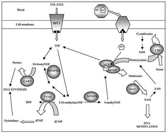 Simplified overview of the human folate metabolic pathway [10]. Enzymes: CBS: cystathionine b-synthase; GART: phosphoribosyl glycinamide transformylase; MTHFD1: methylenetetrahydrofolate dehydrogenase; MAT: methionine adenosyltransferase; MTHFR: methylenetetrahydrofolate reductase; MTR: methionine synthase; MTRR: methionine synthase reductase; RFC1: reduced folate carrier; TC (TCN2): transcobalamin; TYMS: thymidylate synthase. Metabolites: DHF: dihydrofolate; GSH: glutathione; THF: tetrahydrofolate; dTMP: deoxythymidine monophosphate; dUMP: deoxyuridine monophosphate; SAH: S-adenosyl homocysteine; SAM: S-adenosylmethionine. Cofactors: B12: vitamin B12 or cobalamin.