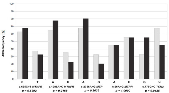 Frequency of occurrence of reference and alternative alleles of selected variants c.665C>T MTHFR, c.1286A>C MTHFR, c.2756A>G MTR, c.66A>G MTRR and c.776G>C TCN2 in the control group (dark bar) and the study group (light bar).