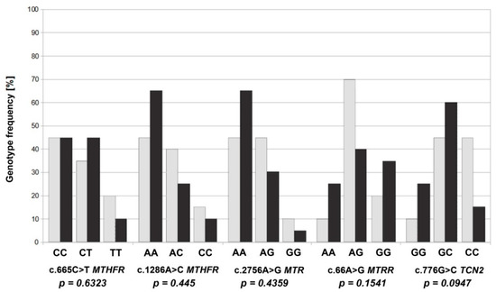 The frequency of the genotypes (homozygous and heterozygous) of selected variants c.665C>T MTHFR, c.1286A>C MTHFR, c.2756A>G MTR, c.66A>G MTRR and c.776G>C TCN2 in the control group (dark bar) and the study group (light bar).