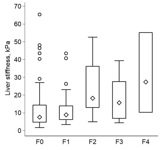 Ten or more valid measurements were obtained in 99.4% (166/167) of the study cohort, with a mean overall success rate of 58.8% (i.e., on average, less than two acquisitions were needed for every one valid Fibroscan measurement). Furthermore, 55.7% of the subjects had a recorded Fibroscan success rate over 60%. A reliable Fibroscan (defined as success rate ≥ 60%, IQR/M ≤ 0.3, and valid measurements ≥ 10) was recorded in 52.7% (88/167) of the entire cohort. There was no statistically significant difference in the number of valid Fibroscan measurements, success rate, or in the reliability between the two groups (F0–F1 vs. F2–F4, Table 3). Importantly, LSM and CAP were significantly higher in the significant fibrosis group compared to the no or non-significant fibrosis group (median LSM = 18.2 vs. 7.7 kPa, p = 0.0004; and the median CAP = 361.4 vs. 317.9 dB/m, p = 0.002, respectively). Figure 2 shows a boxplot distribution of LSM values over fibrosis stages.