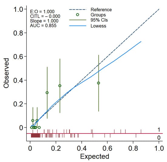 We looked for any potential interaction between the three predictors; no significant interaction was noted. The model calibration was adequate, as reflected in a non-significant Hosmer–Lemeshow goodness-of-fit test (p = 0.567), and as illustrated in a calibration plot with 95% confidence bands for the calibration curve with the reference line over the full range of estimated probabilities included (Figure 4).