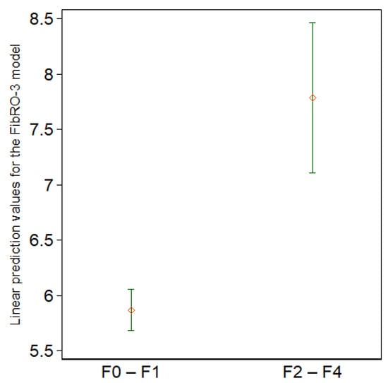 Summary statistics for the linear prediction values according to the presence of significant fibrosis (F0–F1 vs. F2–F4). The diamonds represent the means, whereas the upper and lower short horizontal lines represent the upper and lower ends of the 95% confidence intervals, respectively (n = 167).