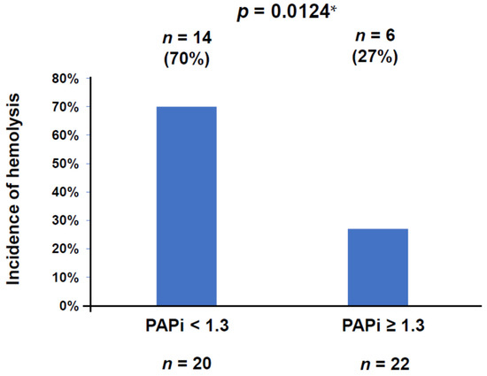 The incidence of hemolysis was significantly higher in the lower PAPi (<1.3) group than in the higher PAPi (≥1.3) group (70% vs. 27%, p = 0.0124) according to Fisher’s exact test. PAPi, pulmonary artery pulsatility index. * p < 0.05 by Fisher’s exact test
