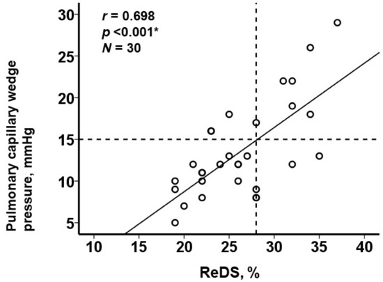 Relationship between ReDS values and PCWP values. A vertical line (ReDS value 28%) indicates a cutoff to predict PCWP > 15 mmHg. * p < 0.05 by Pearson’s correlation coefficient.