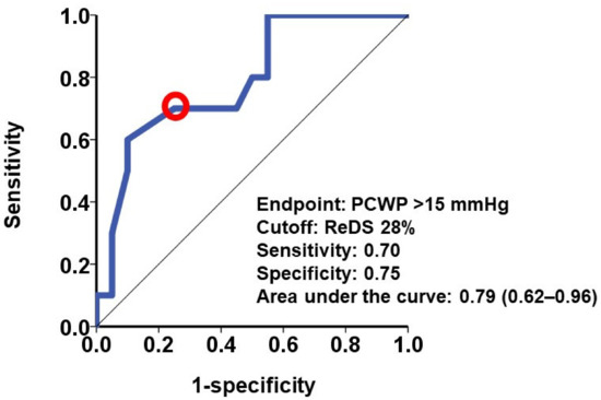 Receiver operating characteristics analysis for ReDS values to estimate PCWP > 15 mmHg. A red circle indicates the cutoff of ReDS value.