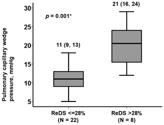 PCWP levels stratified by the cutoff of ReDS 28%. * p < 0.05 by Mann-Whitney U test.