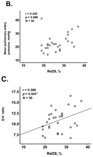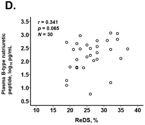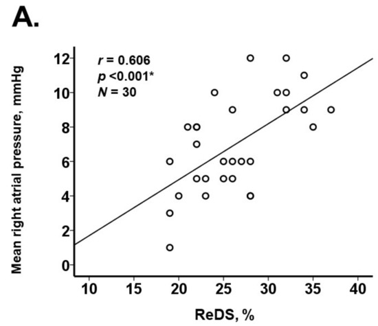 Correlation between ReDS values and other clinical variables including mean right atrial pressure (A), mean pulmonary artery pressure (B), E/e’ ratio (C), and plasma B-type natriuretic peptide (D). * p < 0.05 by Pearson’s correlation coefficient.