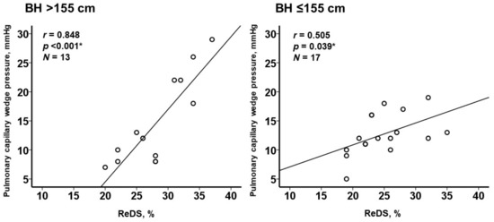 The collinearity between ReDS values and PCWP was significant among those with body height > 155 cm (N = 13) and those with body height ≤ 155 cm (N = 17), respectively, (p < 0.05 for both; Figure 6).