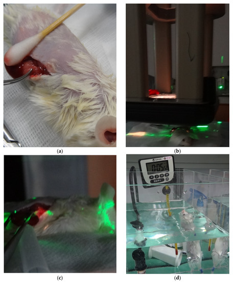 Figure 1. The experimental animal model. (a) The left adrenal gland was surgically explored and exposed to RT. (b) After positioning was confirmed by the laser system, intraoperative RT was administered to the left adrenal glands of mice using a linear accelerator with an electron beam. (c) A light field was used for adrenal gland localization. (d) All mice underwent a swimming test for endurance assessment as a representation of fatigue. Abbreviations: RT, radiotherapy.