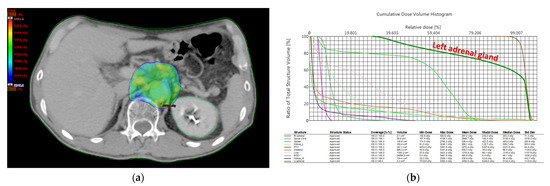 Patients underwent computed tomography (CT) simulation in the supine position and were immobilized with an alpha cradle. The adrenal glands were contoured on CT images while planning. The adrenal glands were located superior and anteromedial to the upper pole of the kidneys and appeared as triangular or y-shaped organs. IMRT was used for all patients. The treatment plans were generated using 6 MV or 10 MV photons. All patients were treated with linear accelerators, and dosimetric parameters, including the mean dose of the left adrenal gland, were collected using RT planning systems (Eclipse Treatment Planning System v.13; Varian Medical Systems Inc., Palo Alto, CA, USA). Dose distributions for the planning and dose–volume histograms (DVHs) were recorded for evaluation (Figure 2).