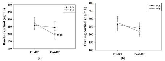 Figure 3. Serum levels of (a) baseline cortisol and (b) evening cortisol. The levels of baseline cortisol declined after RT (p = 0.007) by the paired t-test. The levels of evening cortisol in the 2 Gy group decreased with borderline significance (p = 0.05). ** Differences were significant at the 0.01 level (2-tailed). Abbreviations: RT, radiotherapy.