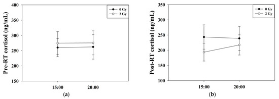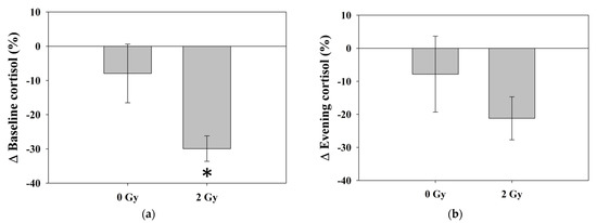 Figure 5. The percentage changes in (a) baseline cortisol and (b) evening cortisol of the 0 Gy and 2 Gy groups. There was a significant difference in Δ baseline cortisol between the 0 Gy group and the 2 Gy group (p = 0.04), whereas no significant difference was noted in Δ evening cortisol between the 0 Gy and 2 Gy groups (p = 0.35). * Differences were significant at the 0.05 level (2-tailed). Abbreviations: Δ, percentage change.
