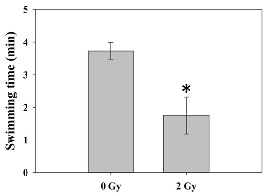 Figure 6. Swimming endurance time. The swimming endurance time decreased following RT. There was a statistically significant difference in 0 Gy and 2 Gy groups (p = 0.02) by independent t-test. * Differences were significant at the 0.05 level (2-tailed). Abbreviations: RT, radiotherapy.