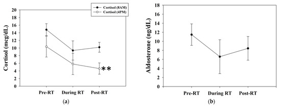 Figure 8. The serum levels of (a) morning cortisol, baseline cortisol, (b) aldosterone, and (c) ACTH. Baseline cortisol levels significantly declined after RT (p = 0.002). There were no significant differences in the levels of morning cortisol, aldosterone, and ACTH before and after RT. ** Differences were significant at the 0.01 level (2-tailed). Abbreviations: ACTH, adrenocorticotropic hormone; RT, radiotherapy.