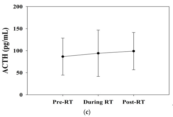 Serum levels of cortisol at 08:00 and 16:00, aldosterone, and ACTH were measured on the day before RT, in the middle of the RT course, and 1 week after RT using radioimmunoassay kits. The cortisol levels at 16:00 were considered baseline cortisol levels according to the circadian rhythm.
