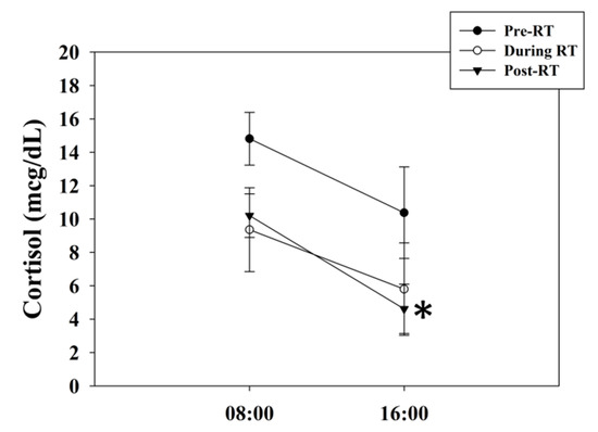 Figure 9. The effect of circadian rhythms on cortisol levels. The difference between morning and baseline cortisol levels was insignificant (p = 0.62) before RT. After RT, there was a significant difference between morning and baseline cortisol levels (p = 0.02). The circadian rhythm seemed to exert a greater effect after RT. * Differences were significant at the 0.05 level (2-tailed). Abbreviations: RT, radiotherapy.