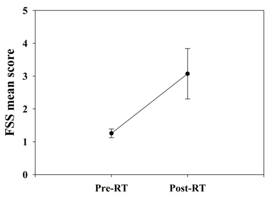 The FSS score slightly increased from 1.2 ± 0.1 to 3.1 ± 0.8 after RT without significant differences (Figure 10).