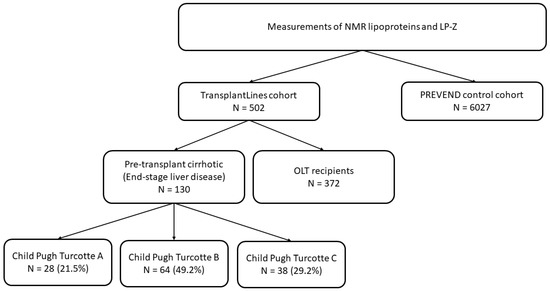 TransplantLines has a continuous data collection which started on June 2015. For the present study, data were collected up to December 2020. During visits at the outpatient clinic, questionnaires and blood samples were collected from all participants according to the TransplantLines protocol. At the time of blood collection, patients continued their regular medication. A standardized protocol was used to obtain anthropometric measurements. Patient information, including weight, height, body mass index (BMI), smoking status, medication use (glucose and lipid lowering drugs), and medical history, such as cardiovascular disease (CVD) and diabetes, was extracted from the TransplantLines Biobank. Additional review of all electronic patient records of study participants was performed in order to retrieve relevant additional data concerning the aetiology of liver disease, non-cirrhotic or cirrhotic state (based on imaging, histology, or transient elastography) at the time of NMR lipoprotein measurements, and biochemical and clinical variables to calculate the MELD and Child Pugh Turcotte (CPT) scores. To assess the severity of chronic liver disease, the CPT and MELD scores were used. The MELD score was calculated by serum bilirubin, creatinine, and international normalized ratio (INR) [38,39]. The CPT score was calculated by total bilirubin, serum albumin, INR, ascites, and hepatic encephalopathy [40].