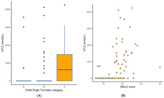Plasma concentrations of LP-Z according to Child Pugh Turcotte classification and MELD scores in the pre-transplant cirrhotic group. (A): Concentrations of LP-Z according to Child Pugh Turcotte classification (Boxplots are shown and bars represent median LP-Z values). Child Pugh C classification vs. Child Pugh Turcotte Classification A and B, Kruskall–Wallis test p < 0.001. (B): Spearman rank correlation coefficient 0.591, p < 0.001.