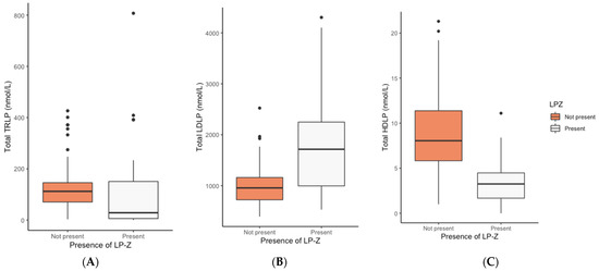 Boxplot of TRLP, LDLP, and HDLP according to presence of LP-Z in pre-transplant cirrhotic group (N = 130). Boxplot (A): TRLP, Boxplot (B): LDLP, Boxplot (C): HDLP. p-values were determined by Mann–Whitney U Test. Abbreviations: HDLP, high density lipoprotein particles; LDLP, low density lipoprotein particles; LP-Z, lipoprotein Z; TRLP, triglyceride-rich lipoprotein particles.