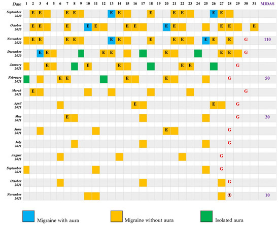 Patient 1 Migraine Diary. E: Eletriptan; G: Galcanezumab; MIDAS: Migraine Disability Assessment Test Score;