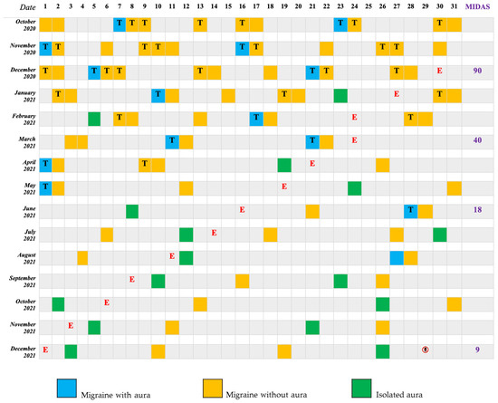 During his last presentation at our Emergency Room of Tor Vergata Hospital in December 2020, he reported a burden of 12 monthly migraine days, fulfilling the ICHD-III criteria for high-frequency episodic migraine [11], and rated 90 on MIDAS (see Figure 2). Several previous prophylactic drugs were reported to be useless (topiramate, lamotrigine, amitriptyline, and fluoxetine) or not tolerated (Beta-blockers due to sinusal bradicardya). Oral triptans were effective and often taken up to 3 doses/attack. Therefore, in line with the Italian migraine guidelines [12], a subcutaneous therapy was prescribed with the commercially available anti-CGRP receptor monoclonal antibody Erenumab at a dosage of 140 mg per month.