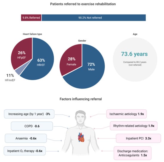 Central illustration of key findings (created with BioRender.com). Bottom image: Factors which decreased the odds of referral are shown in blue, while factors that increased the odds of referral are shown in pink. The multiplication factor is derived from the odds ratios reported in Table 2, Section 3.3. HFpEF; Heart failure with preserved ejection fraction, HFrEF; Heart failure with reserved ejection fraction, HRmrEF; Heart failure with mid-range ejection fraction, COPD; Chronic obstructive pulmonary disease, PCI; Percutaneous coronary intervention.