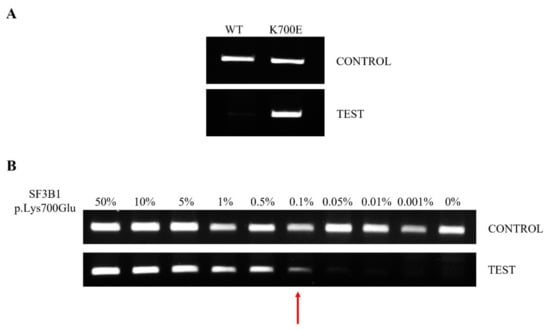 Electrophoretic runs of PCR reactions: each amplicon was loaded on 2% agarose-TBE 1× gel with 5 μg/mL EtBr and run at 150 V for 30 min. PNA-PCR clamping for SF3B1 was carried out in the absence (CONTROL) and presence (TEST) of the PNA probe. (A) Example of PNA-PCR clamping in DNA from WT and p.Lys700Glu-mutated patients. CONTROL PCR represents an internal control and DNA must always be amplified. TEST PCR returns the result about the mutational status of SF3B1; if the patient is SF3B1 WT, the gDNA is not amplified, while if the patient is SF3B1 p.Lys700Glu, the gDNA is amplified. (B) PNA-PCR clamping LoD was assessed by mixing pGEMT-SF3B1 p.Lys700Glu and pGEMT-SF3B1 WT plasmids at different ratios in the same PCR reaction. Dilutions were as follows: 50, 10, 5, 1, 0.5, 0.1, 0.05, 0.05, 0,01, 0.001 and 0% pGEMT-SF3B1 p.Lys700Glu, all brought to 100% with the respective amount of pGEMT-SF3B1 WT template. The percentage of the mutated template is indicated above each amplicon. The red arrow indicates the LoD of the PNA-PCR clamping method.