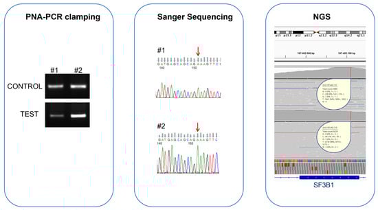 Compared with other currently available methods, such as Sanger sequencing and HRM analysis, PNA-PCR clamping has been shown to have a better LoD and a lower cost, both in terms of reagents and instrumentation. Although the other two techniques cited allow other SF3B1 mutations to also be evaluated, PNA-PCR clamping can be easily implemented to evaluate other hotspots, without significantly affecting the cost and timing of execution, which remain lower than Sanger sequencing or HRM analysis.