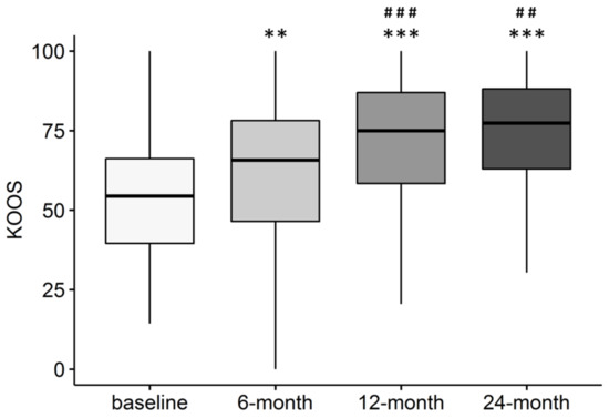 | Follow-Up | KOOS Pain Score | p Value vs. Baseline |
