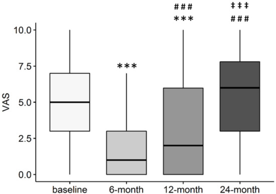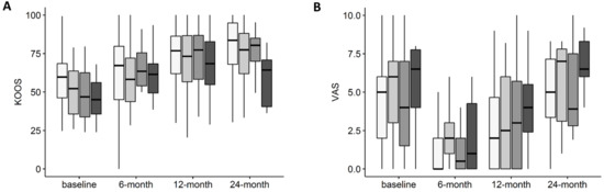3.3. Variation of KOOS and VAS Depending on OA KL Grade