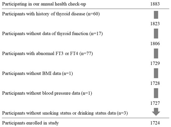 Figure 1 shows the demographic of the present study population. The study population comprised of 1883 Japanese individuals aged 40–74 years from Saza town in western Japan who underwent an annual medical examination in 2014. To preclude any influence of thyroid disease, participants with a history of thyroid disease (n = 60), missing data on thyroid function (TSH, FT3, or FT4) (n = 17), or abnormal FT3 (normal range, 2.1–4.1 pg/mL) or FT4 (normal range, 1.0–1.7 ng/dL) levels were excluded (n = 77). In addition, participants with missing data on body mass index (BMI) (n = 1), blood pressure (n = 1), or smoking status or drinking status (n = 3) were excluded. The remaining 1724 participants, with a mean age of 60.5 years (standard deviation (SD), 9.1 years; range, 40–74 years), were included in the study.