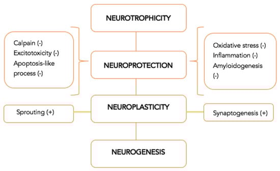 Presently, the existence of an endogenous defense mechanism that incorporates neurobiological mechanisms, such as neuroprotection, neurotrophicity, neuroplasticity and neurogenesis, is already acknowledged. The central nervous system assesses controlling influence with modifying and repairing roles on different levels endogenously []. For this reason, their augmentation represents a therapeutic target [].