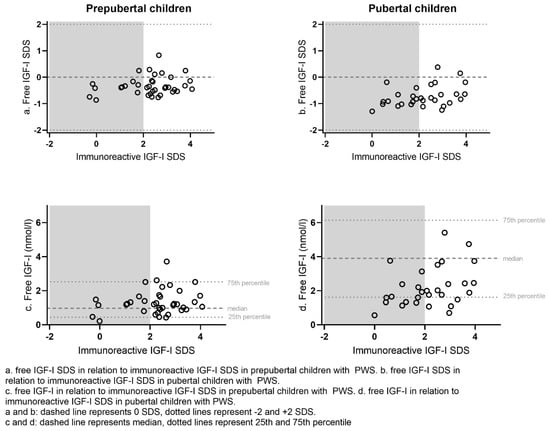 This study shows that, while 70.0% of prepubertal children with PWS and 56.7% of pubertal children with PWS had a serum immunoreactive IGF-I > 2 SDS, free IGF-I was within the normal reference range in all children, which is reassuring. In fact, free IGF-I SDS was relatively low, as 85.0% of the prepubertal children and 93.3% of the pubertal children with PWS had a free IGF-I < 0 SDS.