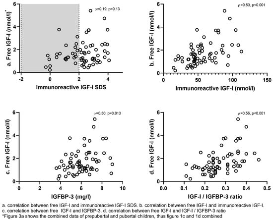 We, therefore, compare free IGF-I levels with immunoreactive IGF-I levels in the serum of GH-treated children with PWS. We hypothesize that during GH treatment, free IGF-I would be in the normal range despite high immunoreactive IGF-I levels. Secondly, free IGF-I levels in children with PWS are compared with free IGF-I levels in age-matched healthy controls. To investigate if we could find a proxy for free IGF-I levels, correlations of free IGF-I with immunoreactive IGF-I, IGFBP-3 and the IGF-I/IGFBP-3 ratio are determined. In addition, we investigate the associations between free IGF-I and body composition.