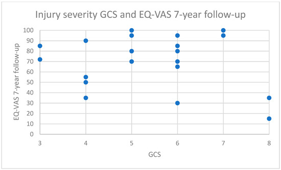 Injury severity on GCS at time of admission and EQ-VAS (overall health) at 7-year follow-up.