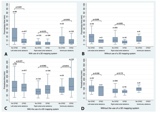 | Group | Number of EP Studies (Overall/w/o CFSC/w CFSC) * | Fluoro Time w/o CFSC (min) † | Fluoro Time w CFSC (min) † | p-Value ‡ | Procedure Time w/o CFSC (min) † | Procedure Time w CFSC (min) † | p-Value ‡ |