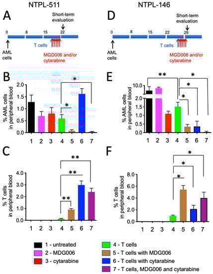 Short-term effect of MGD006 treatment in pediatric AML PDX models. (A,D) Schematic showing timeline of treatment. (B,C) Peripheral blood was collected on day 22 (treatment ended day 21) from NTPL-511 mice to determine AML (CD45+ CD3−) and T-cell (CD45+ CD3+) percentage by flow cytometry. (E,F) Peripheral blood collected from NTPL-146-transplanted mice on day 31 (treatment completed day 30) was used for calculating percentage of AML and T cells by flow cytometry. * p < 0.05, ** p < 0.01. The X-axis in B–F indicates treatment group numbers (1) untreated, (2) MDG006, (3) cytarabine, (4) T cells, (5) T cells with MGD006, (6) T cells with cytarabine, and (7) T cells with concurrent administration of cytarabine and MGD006.