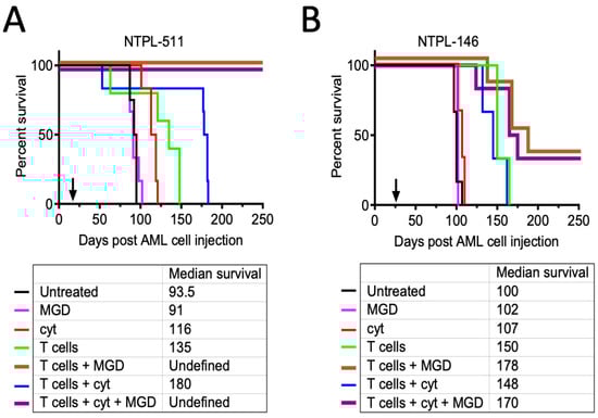 Efficacy of MGD006 in pediatric AML PDX models. (A,B) Kaplan–Meier survival plots showing the median survival. Arrow indicates time when treatment began.