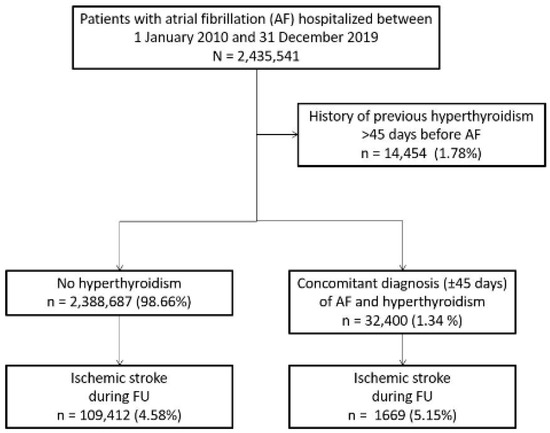 - Kim, K.; Yang, P.-S.; Jang, E.; Yu, H.T.; Kim, T.-H.; Uhm, J.-S.; Kim, J.-Y.; Sung, J.-H.; Pak, H.-N.; Lee, M.-H.; et al. Increased risk of ischemic stroke and systemic embolism in hyperthyroidism-related atrial fibrillation: A nationwide cohort study. Am. Hear. J. 2021, 242, 123–131. [Google Scholar] [CrossRef] [PubMed]