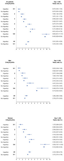 The yearly incidence of stroke in AF patients stratified by sex, CHA2DS2-VASc score and presence or absence of concomitant hyperthyroidism during the first year of follow-up.