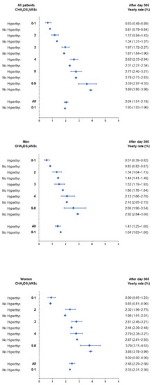 The yearly incidence of stroke in AF patients stratified by sex, CHA2DS2-VASc score and presence or absence of concomitant hyperthyroidism beyond the first year of follow-up.