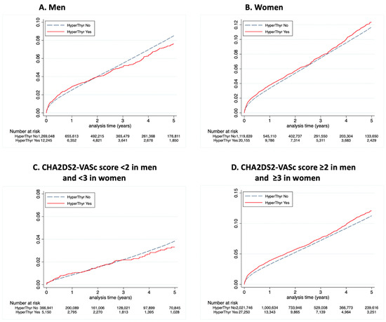 The cumulative incidence for ischaemic stroke in different sex groups and CHA2DS-VASc score. Cumulative incidences for ischaemic stroke in men (A), women (B), CHA2DS2-VASc score <2 in men and <3 in women (C), and CHA2DS2-VASc score ≥2 in men and ≥3 in women (D) with and without hyperthyroidism concomitant to AF diagnosis (interval <45 days between first diagnoses of AF and hyperthyroidism).