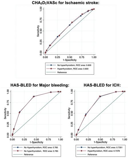 Receiver operating characteristic (ROC) curves were constructed, and Harrell C indexes (i.e., area under the curve) were calculated to investigate the predictive value of CHA2DS2VASc and HAS-BLED scores in patients with and without hyperthyroidism; the two curves were compared using the DeLong test.