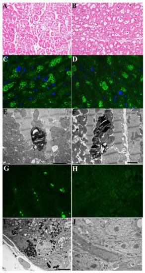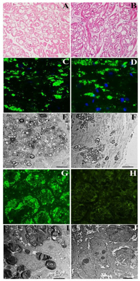 Pathologic evaluation of myocardial and intestinal tissue in a 72-year-old woman (Case 1) affected by Fabry disease before and after 2 years of agalsidase-α. (A–F) Myocardium unchanged cardiomyocyte dimensions and vacuolar area in H&E (A,B), immunofluorescence for Gb3 (C,D) and electron microscopy (E,F) comparing pre (A,C,E) and post (B,D,F) findings. (G–J) Intestinal tissue mobilization of Gb3 in immunofluorescence (G,H) and ultrastructural examination (I,J), comparing pre- (G,I) and post-treatment (H–J) features.