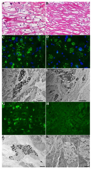 A 43-year-old normotensive man belonging to the same family as Cases #1 and #2, with GLA mutation (c.666delC), 0% α-Gal-A activity and elevated Lyso-Gb3 (69.22 nMol/L; laboratory normal < 2.3), presented with ECG sinus rhythm, but short PR interval (110 ms), increased QRS voltages and moderate LV hypertrophy (MWT 16 mm at 2-D echo) with preserved end-diastolic diameter (50 mm) and EF (60%), associated with effort dyspnea. The major symptoms were, however, related to gastrointestinal tract consisting of diarrhea and weight loss: lately he reached the weight of 40 kg and developed iron-deficiency anemia (Hb 9.8 gr/dL, serum ferritin 13 ng/mL). He had a sinus rhythm of 74 bts/min with short PR (115 ms) and increased QRS voltages at ECG. CMR showed a reduced T1 Mapping (T1 874–883 ms) indicating glycolipid accumulation and LGE positive areas in the LV lateral wall denoting fibrosis. The patient underwent a coronary angiography that showed normal arteries. An LV endomyocardial biopsy documented hypertrophied cardiomyocytes with large intracellular vacuoles on H&E stain that were positive for GL3 by immunofluorescence microscopy and contained myelin-like glycolipid bodies at TEM (Figure 3A–F). Gastric and duodenal biopsies revealed extensive intracellular GL3 accumulation by immunofluorescence microscopy (Figure 3G) and Fabry inclusions on ultrastructural evaluation (Figure 3J). This duodenal biopsy also included intestinal ganglion cells which showed cytoplasmic vacuolization. He was treated with agalsidase alpha (0.2 mg/kg every other week), followed every three months by a physical examination, Hb and serum iron and 2D-echocardiogram. After 2 years of treatment, he had repeated CMR, endomyocardial and gastric and duodenal biopsies. While cardiac symptoms, CMR and cardiomyocyte parameters (Figure 3B,D,F vs. Figure 3A,C,E) remained unchanged, diarrhea disappeared soon and anemia and serum iron were recovered (Hb 14.5 gr/dL), and body weight was increased by 5 kg (becoming 45 kg). A follow-up intestinal biopsy showed complete tissue clearance from GL3 inclusions (glycolipid bodies) by both immunofluorescence (Figure 3H vs. Figure 3G) and TEM (Figure 3J vs. Figure 3I).